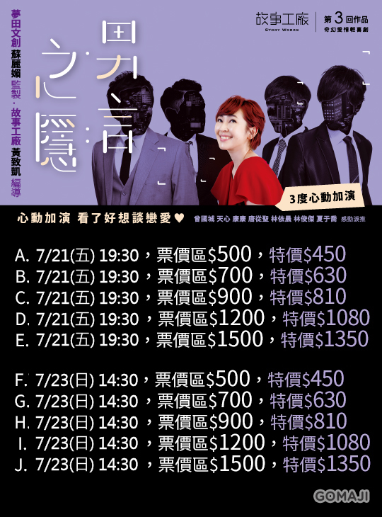只要450元起,即可享有【故事工廠】男言之隱 2017心動加演〈單人票一張,場次時間:7/21(五) 19:30、7/23(日) 14:30,票價區:500/700/900/1200/1500〉